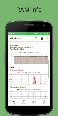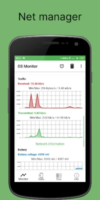 OS Monitor pruža snažno i jednostavno praćenje vašeg Android uređaja. Pregledajte ključne komponente sustava kao što su baterija, CPU, RAM i mrežni promet. Pratite pokrenute procese te utjecaj aplikacija na aktivnost i performanse vašeg uređaja.