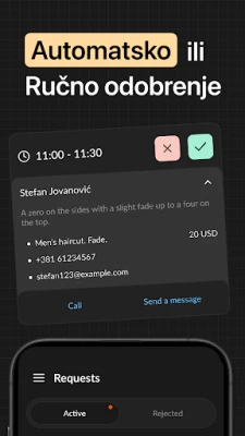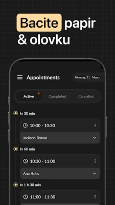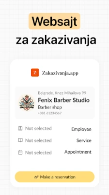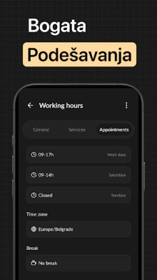 Ova aplikacija omogućuje vlasnicima poslovanja jednostavno upravljanje. Postavite radno vrijeme, dodajte usluge, cijene i zaposlenike. Pratite sve nadolazeće termine i primajte obavijesti u stvarnom vremenu o zakazivanjima ili otkazivanjima. Vaši klijenti rezerviraju termine putem personalizirane web stranice koju aplikacija automatski generira za vas.